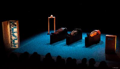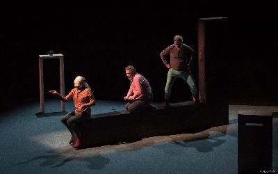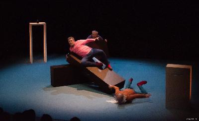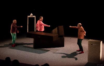 Ils se mettent à faire les fous, à s’imaginer des exploits terribles. Alors ils chahutent, se perdent dans leurs imaginations, cabriolent tant et si bien que d’un coup Ernest fait un malaise. Tout le monde se pose. On ritualise le petit déjeuner avec la cérémonie du Thé. Mais voilà cette angoisse qui surgit : « si on avalait de travers et qu’on en meure » ? Arrêt sur image, valse de la théière telle une patate chaude, dispute, menaces, honte…silence. Toc Toc à la porte…c’est encore la Mort ? Les trois compères filent sous la table. Des pas résonnent au loin, la grande inconnue repart. Se relever devient difficile, courbatures et craquements. Bien ! Faisons le bilan de notre vie, c’est parti ! Les souvenirs s’effeuillent comme la scène de la petite fille à la bicyclette rouge, c’était l’amour…