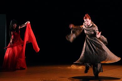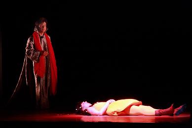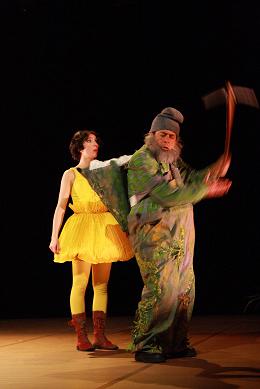 Trois comédiens et une danseuse jouent tous les personnages sur une scène nue dans des lumières finement teintées et des sonorités les plus originales. Les éléments matériels sont représentés par le jeu chorégraphique des acteurs.
